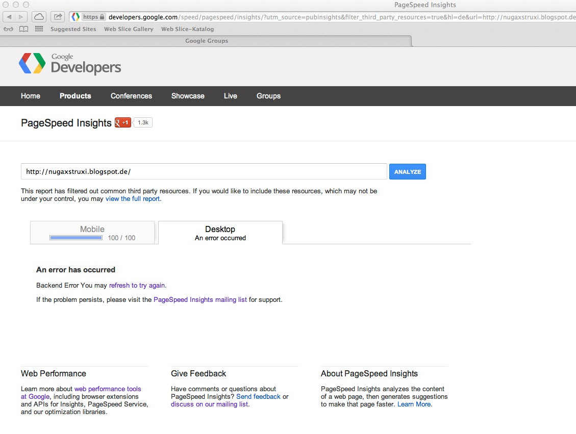 Leider bekam ich bei der Auswertung der Desktop-Version des Blogs nur einen Fehler ausgegeben. Nach erfolgloser Recherche habe ich einen Beitrag im Support-Forum von Google gepostet – da bin ich mal gespannt, ob und wann der Post beantwortet und das Problem erfolgreich gelöst wird. Leider bietet Google keine aufschlussreichen Fehlercodes oder eine informative Auflistung von FAQ´s an, die dieses Thema betreffen.