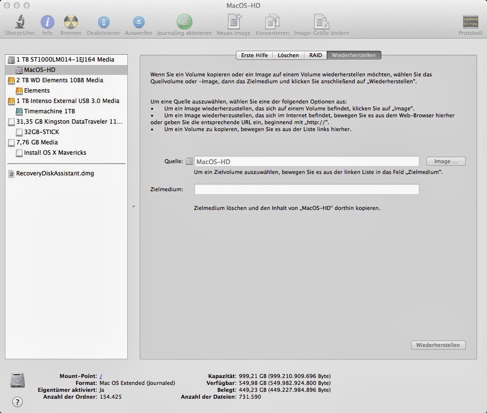 OS X Lion war das letzte Mac-Betriebssystem, bei dem ein Installationsmedium von Apple zur Hardware beigelegt wurde. Seit OS X 10.8 (Codename Mountain Lion) liegt keine Installations-CD/DVD mehr bei. OS X 10.9 (Codename Mavericks) ist nur noch über den App-Store erhältlich. Was tun also, wenn man das System auf ein neues Medium übertragen möchte? Sicher, die Daten und Einstellungen werden (falls eingerichtet) per TimeMachine-Backup auf ein externes Medium (USB-HDD, Netzwerkfreigabe) gesichert, aber was ist mit dem Betriebssystem? Apple hat für den Fall, dass das installierte Betriebssystem mal nicht so möchte, wie der Anwender eine Restore-Partition (versteckt) angelegt. Hält man beim Start ALT lange gedrückt, kommt man zur Auswahl des Bootmediums. Hier sollte im Normalfall die normal verwendete HDD („Macintosh HD“) auftauchen und evtl. das TimeMachine-Backup.
