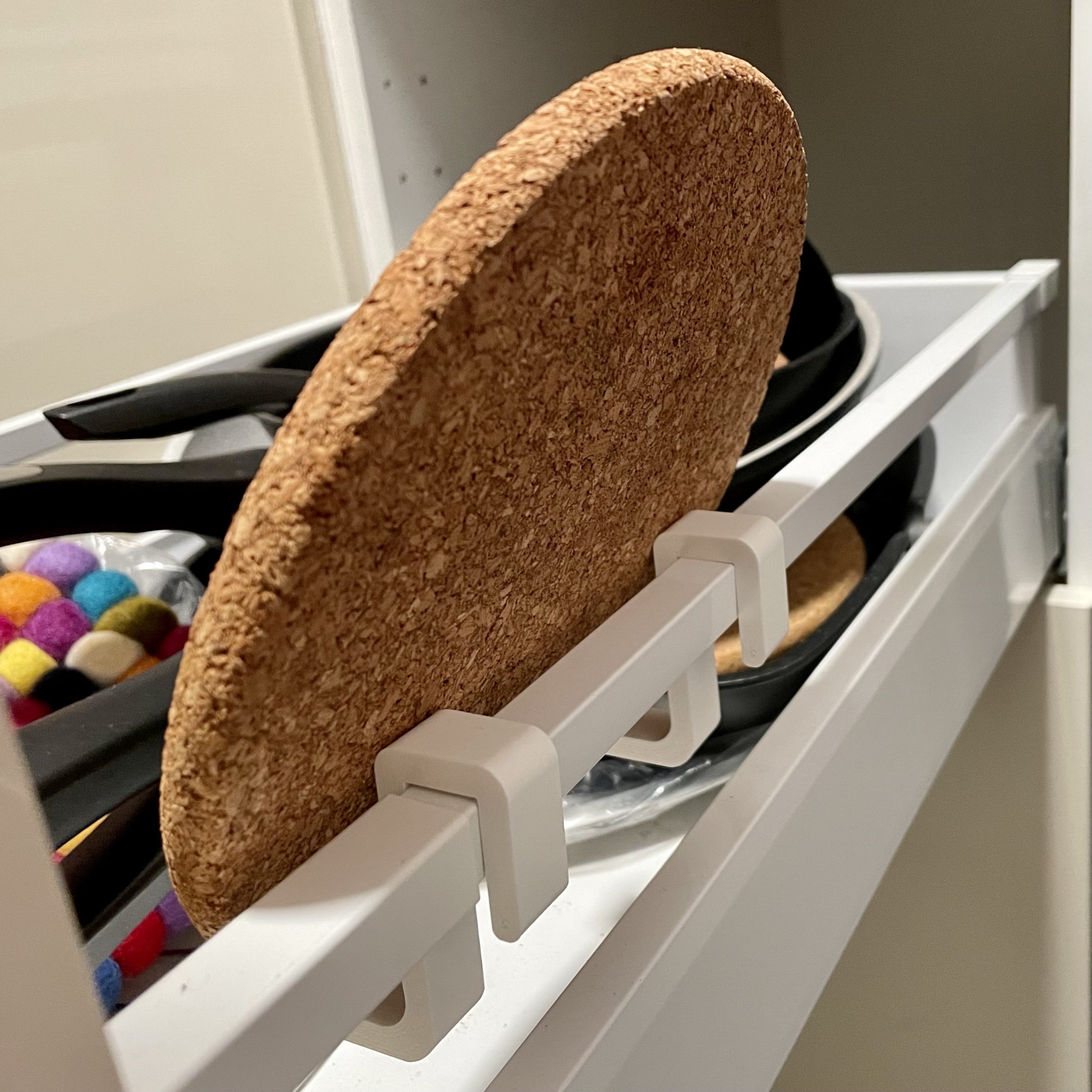 Haken (2Stk.) für Ikea Metod-Schubladen. Die Haken wurden im 3D-Druckverfahren (FDM) aus Bio-Kunststoff PLA (weiß) hergestellt. Sie können variabel auf der Seitenverstrebung verschoben werden und Kochgeschirr, Topflappen oder Untersetzer aufnehmen, um Ordnung in der Schublade zu halten. Das Set besteht aus zwei Haken, die einzeln oder nebeneinander verwendet werden können.