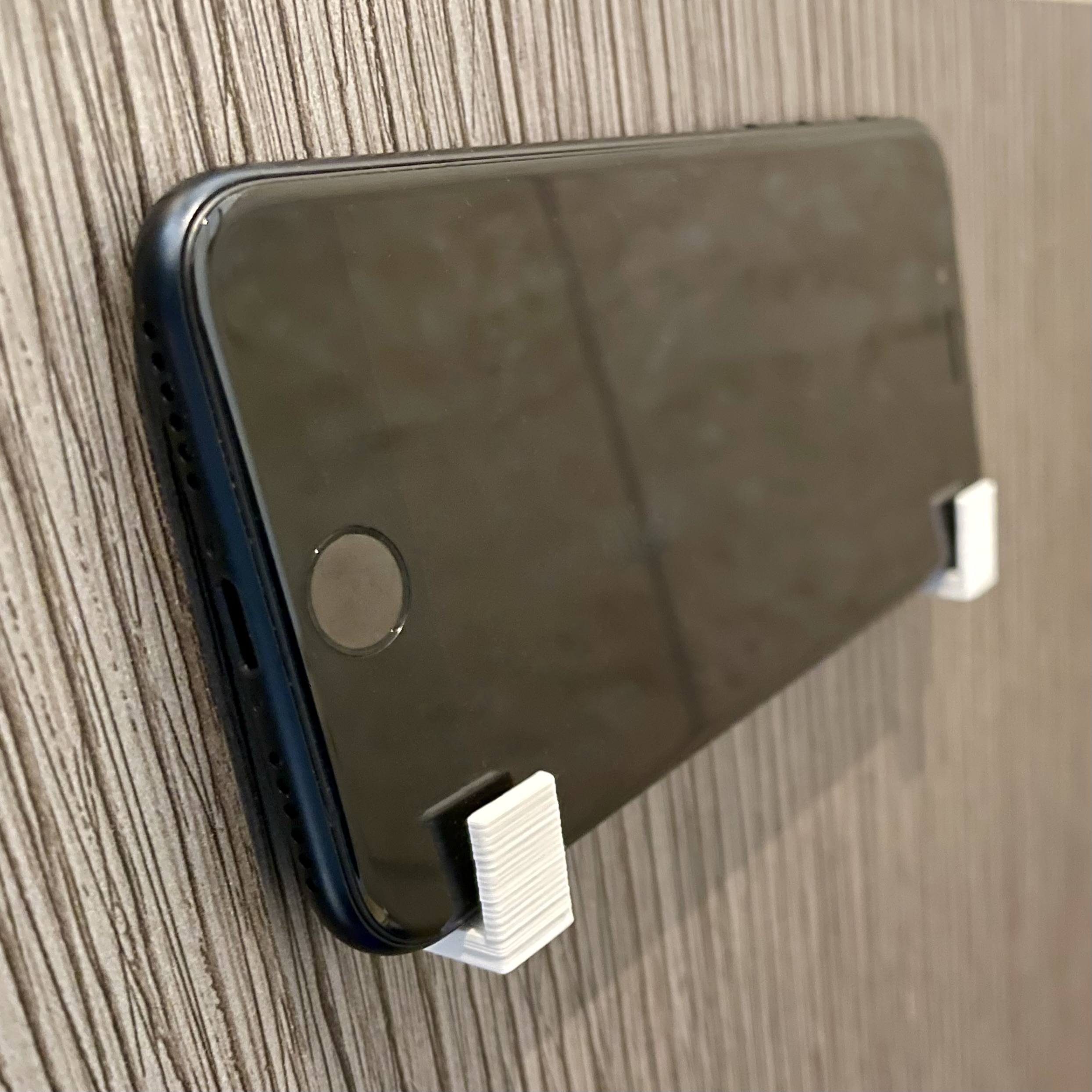 Set aus zwei Wandhaken zur Smartphone-Ablage. Getestet mit Samsung Galaxy S21, iPhone X/XS/12/12 Pro. Durch die zwei leichtgewichtigen Wandhaken kann der Abstand je nach Smartphone-Modell frei bestimmt werden. Das Set kommt mit zwei Streifen doppelseitigem Klebeband der Hersteller Tesa oder 3M auf der Rückseite, bietet aber auch eine Einkerbung, um die Halterung mittig mit einer dünnen Bohrung zu versehen und sie an Wand oder Möbelstück zu verschrauben.