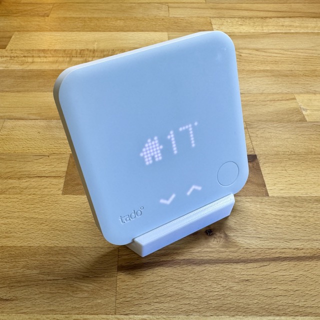 Tischaufsteller für das tado Raumthermometer. Damit kann es sicher und gut sichtbar auf dem Tisch oder dem Sideboard stehen. Einfach reinstellen, fertig!